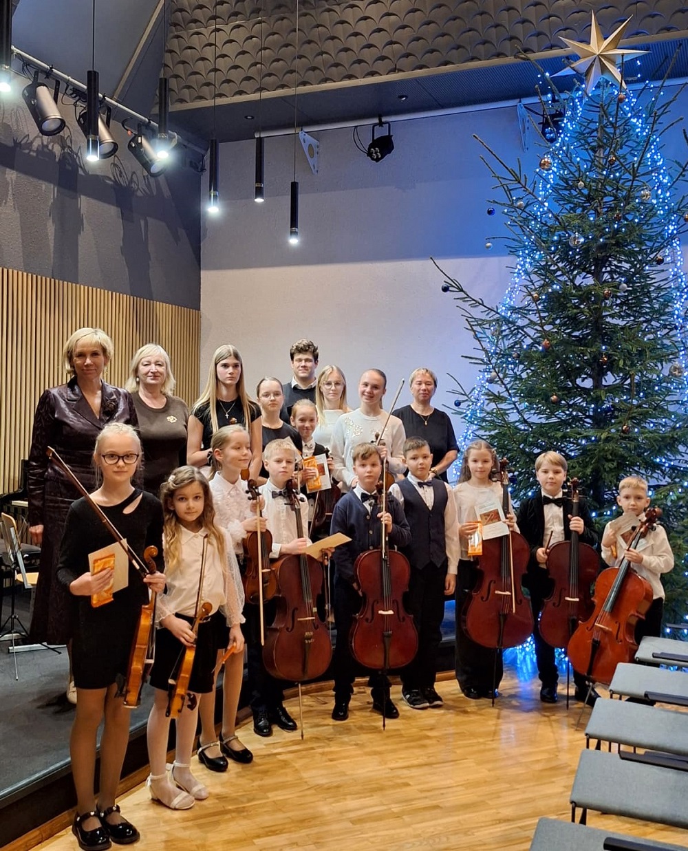 Otrdienas vakarā skolas zāles egle ļāvās burvīgām stīgu vibrācijām – muzicēja vijoles un čella klašu audzēkņi. Pedagogi Aiva Avotiņa un Kristaps Grīnbergs bija kopā veidojuši daudzveidīgu programmu, tajā nozīmīga vieta