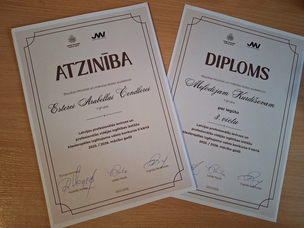 Jelgavas MV notikušajā Valsts konkursa klavierspēlē 2.kārtā piedalījās trīs mūsu skolas audzēkņi – Danielas Jukšas skolotā Arabella Estere Čendlere, Mefodijs Kurdiševs, kura skolotāja ir Ineta Rozentāle, un Elīza Lediņa, skolotājas Līgas Jaunliniņas audzēkne.