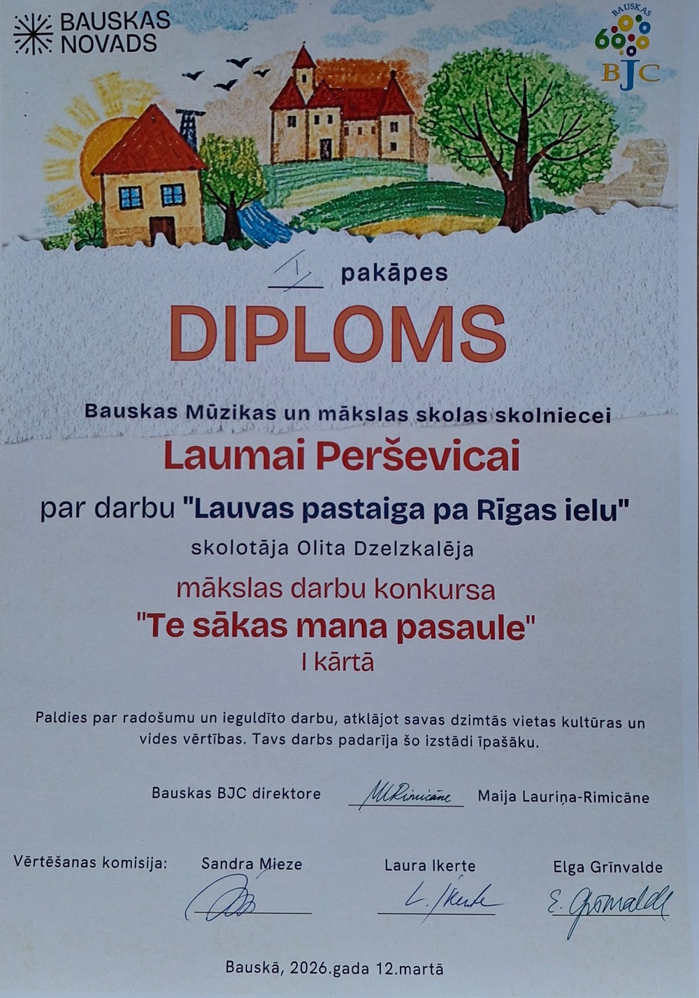 Mūsu skolas Mākslas nodaļas interešu izglītības pulciņu audzēkņi ar saviem radošajiem darbiem piedalījās Bauskas novada skolēnu vizuālās un vizuāli plastiskās mākslas konkursizstādē “Te sākas mana pasaule”. Skolēni savos radošajos darbos pauda savu skatījumu uz savām mājām, skolu, pagastu, pilsētu un novadu – to simboliem, kultūrvēsturiskajām vērtībām, tradīcijām un ainavām. Priecājamies par audzēkņu radītajiem darbiem un konkursa rezultātiem!