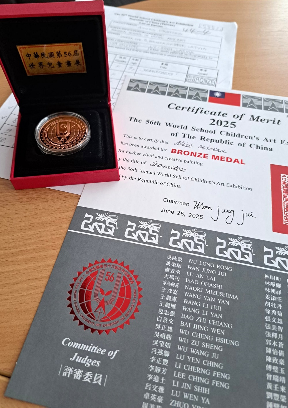 Pedagoģe Mārīte Šulce vēstī, ka 56. pasaules skolēnu mākslas izstādē Taivānā atzinības saņēmuši Olitas Dzelzkalējas audzēkņi Laura Jasmīna Auzāne, Kristiāna Andilevko, Līva Grosberga, Loreta Kuprinska, Agnese Leveika, Ralfs Rušmanis, Līze Ģedraite, Estere Zaharčenoka, Aijas Ušerovskas audzēknis Marts Selakovs. Konkursa bronzas medaļu saņems M.Šulces audzēkne Alise Seškēna. Katalogā lasām, ka Alises gleznotā sieviete smaida pie uzšūtajiem tērpiem, un pustoņos uzgleznotā kompozīcija rada mierīgu noskaņu.
