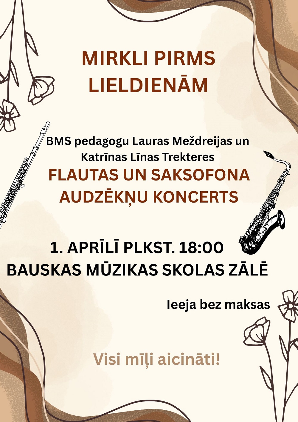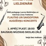 “Mirkli pirms Lieldienām” L.Meždreijas un K.L.Trekteres flautas un saksofona klases audzēkņu koncerts + Add to Google Calendar + iCal export 00 dienas 00 stundas 00 minūtes 00 sekundes Datums Tre Apr 2026 Laiks 18:00 - 19:00 Atrašanās vieta Bauska, Upmalas iela 5 Organizators Bauskas MMS Dalies ar citiem